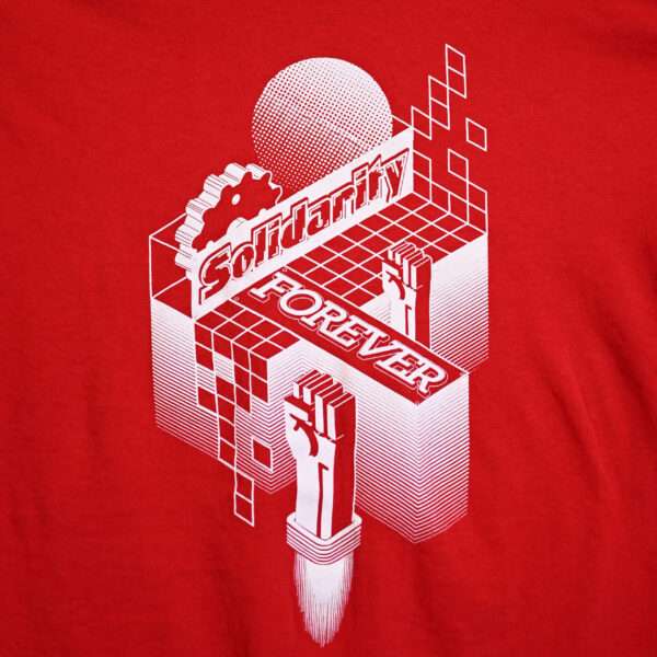Crew-neck t-shirt in red with an industry-inspired design and “Solidarity Forever” on the front, “Strike Support” on the back. Unisex sizing.